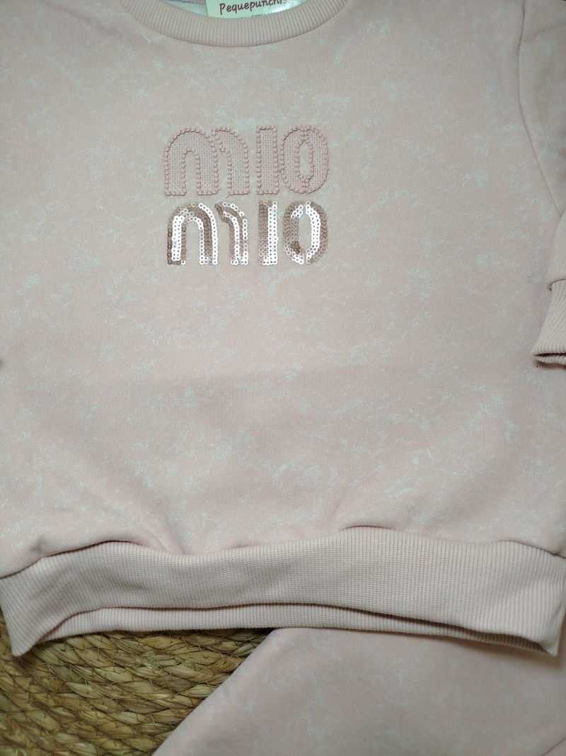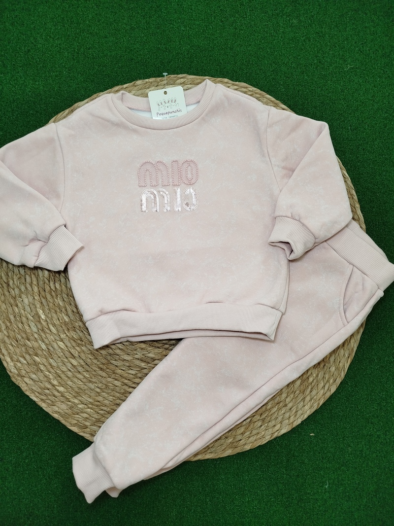 Chandal para niña en color rosa empolvado con lentejuelas en sudadera. Perfecto para el dia a dia, Es afelpado por dentro. Ideal para el Invierno.
